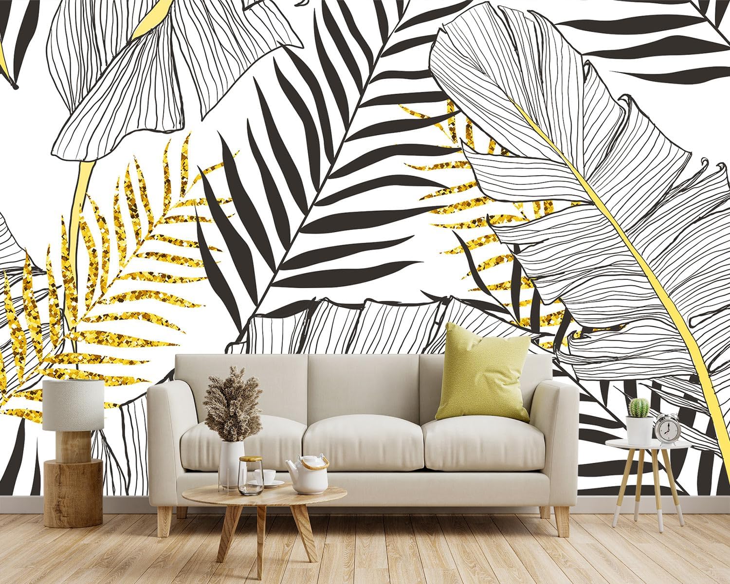 -Black and Gold Tropical Botanical Banana Leaf Fabric Wallpaper Living Room Bedroom Bathroom Abstract Plant Large Wall Mural- 137"x96"( not Peel and Stick)