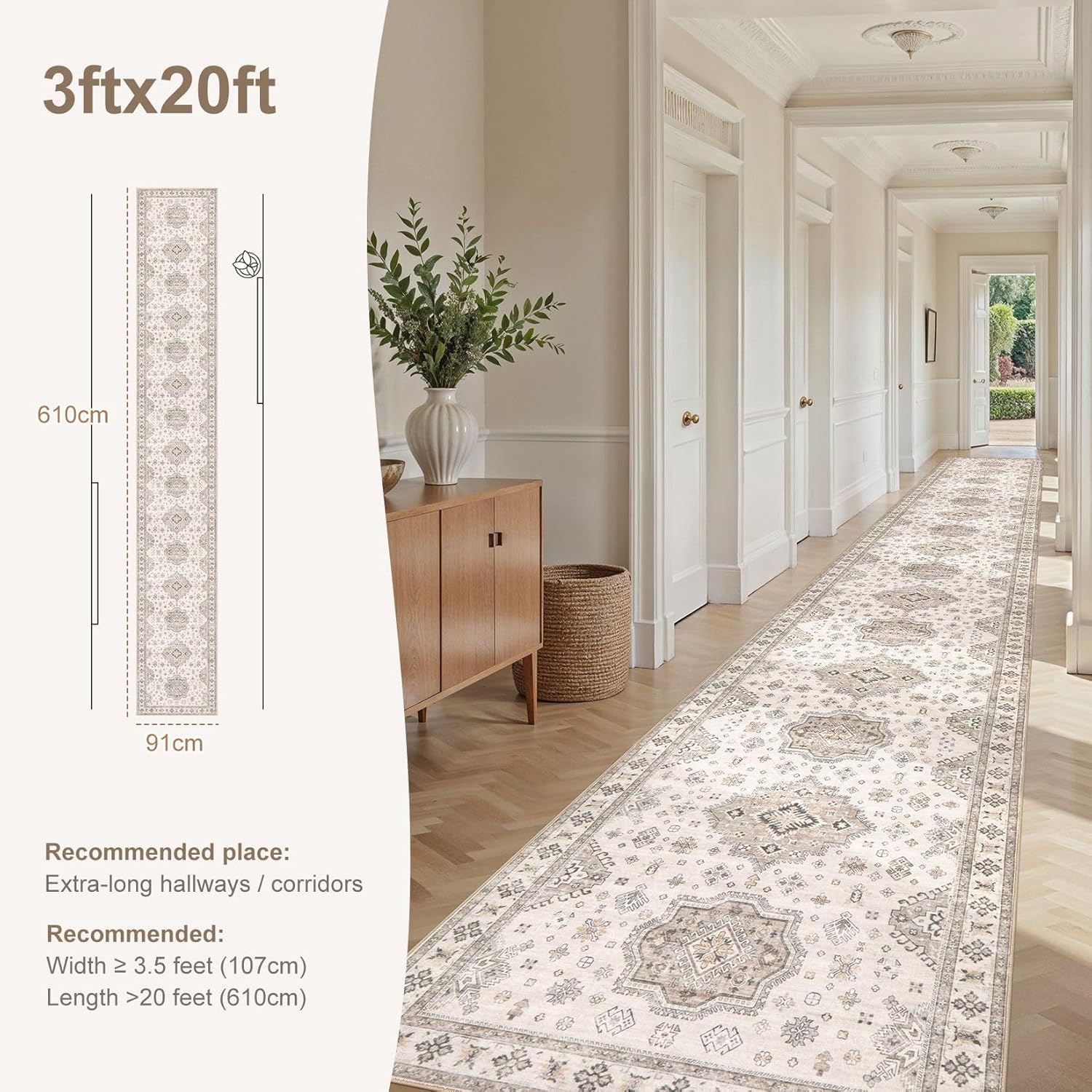 Washable 3x20 Runner Rug - Area Rugs Neutral Vintage Distressed Floral Farmhouse Boho Large Soft Floor Rug Indoor Carpet for Hallway Entryway Home - Beige Brown